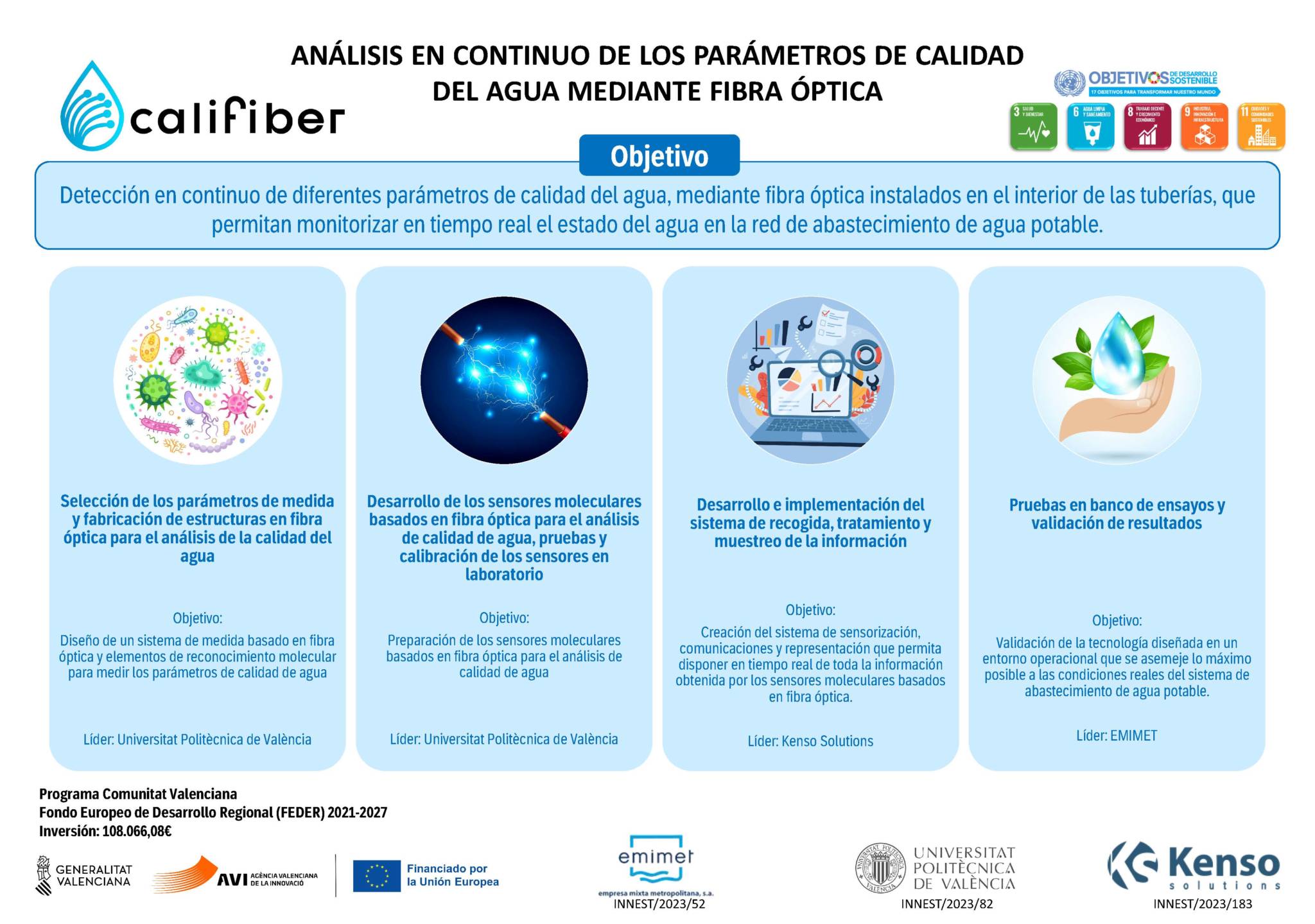 Con todo esto, el principal objetivo del proyecto que se propone es la detección en continuo de diferentes parámetros de calidad del agua, mediante cables de fibra óptica instalados en el interior de las tuberías, que permitan monitorizar en tiempo real el estado del agua en la red de abastecimiento de agua potable.