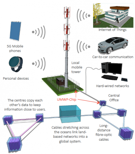 Un segundo ámbito de aplicación son las comunicaciones 5G. La proliferación reciente de dispositivos conectados a internet, bien para fines personales (wearable devices), públicos (smart cities), privados (domótica) y en general, para uso profesional (smart devices, data center, etc.), y como consecuencia, el nacimiento de Internet de las Cosas (Internet of Things, IoT), provoca un aumento de capacidad estimada en un factor 1000 para las redes de comunicaciones inalámbricas de quinta generación (5G) respecto a las redes 4G. El desarrollo de dispositivos, tecnologías y arquitecturas