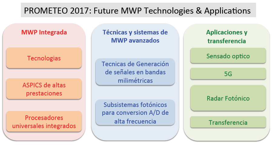 Dos ejemplos paradigmáticos de sistemas avanzados de MWP son los generadores de señales de RF en bandas milimétricas para su explotación en las futuras comunicaciones móviles 5G y los conversores analógico digitales (ADCs) fotónicos que son bloques esenciales en sistemas de exploración electromagnética. En el caso de las comunicaciones 5G se necesita desarrollar generadores que, ubicados en la estación central sean capaces de producir señales de RF de frecuencias comprendidas entre (24 GHz – 90 GHz) y distribuirlas a las estaciones base.  En el caso de los sistemas de exploración electromagnética, aunque la aplicación militar ha sido dominante durante muchos años, hoy en día su empleo en aviación civil y su más que probable necesidad en el soporte de los sistemas de conducción autónoma, el sensado remoto y la instrumentación de elevado ancho de banda hace que cada vez sean precisos sistemas de frecuencia más elevadas. Por ejemplo, en aplicaciones de conducción autónoma (Smart Car) será necesario integrar soluciones flexibles de exploración radar para detectar objetivos ocultos (fundamentalmente a 24 GHz) y para las tareas propias de control de la conducción (fundamentalmente a 77 GHz). Para ello es necesario disponer de conversores ADC con gran ancho de banda (>40Ghz) y jitter temporal muy reducido (<15 fseg), una solución que solo es posible empleando tecnología MWP para implementar radares fotónicos.