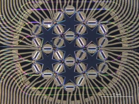 Un segundo desafío consiste en diseñar una única arquitectura común de chip que pueda llevar a cabo múltiples funcionalidades mediante programación, de forma análoga al funcionamiento de un dispositivo FPGA (Field Programmable Gate Array) en electrónica. En el seno del proyecto  PROMETEO TECNOLOGIAS DE NUEVA GENERACION EN FOTONICA DE MICROONDAS (GVA-2013-012) hemos diseñado y desarrollado un primer prototipo basado en una malla hexagonal de 7 celdas compuestas por guiaondas de Silicio.