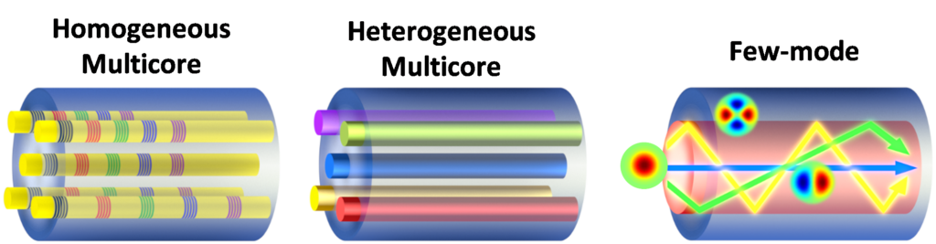 - Few-mode fibres. The objective here is to tailor the dispersion behaviour of individual modes to achieve a constant differential group delay, while providing control over the losses and the intermodal crosstalk.